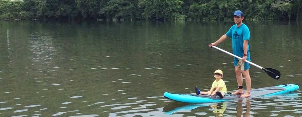 在丰田市水源公园每周星期一・星期三・星期四的上午、星期六・星期日全天举办SUP体验学习班。在学习班学习过并且听过安全讲座的朋友,可以租借SUP。