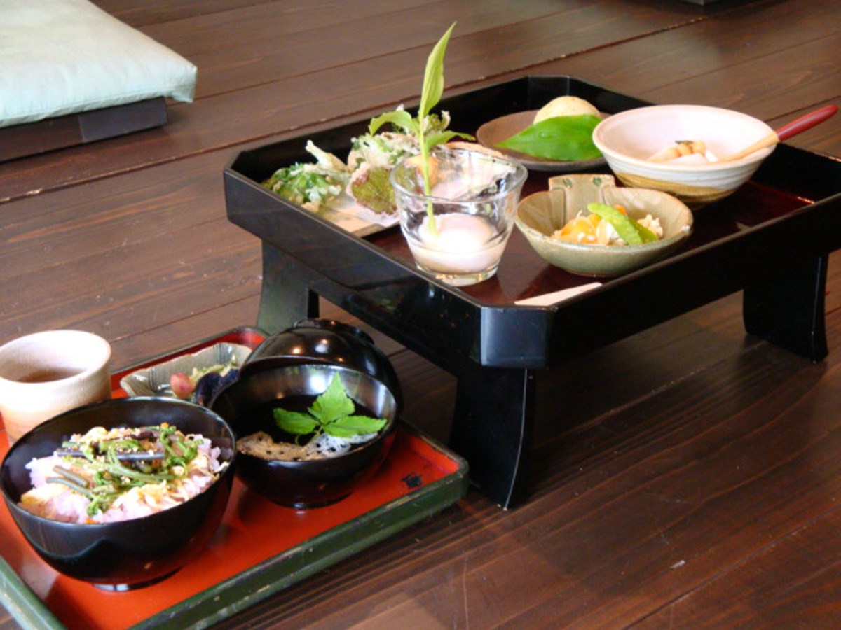 使用当地空气和土地培育出的新鲜野菜、竹笋、天然香鱼、菌类、野山药、野猪肉等时令食材烹制的料理。