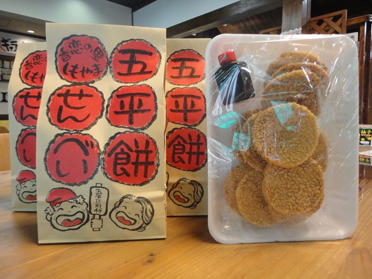 在下山地区许多的饮食店中,能够尝到使用当地栽培的“峰旭”米制成的五平饼。把下山地区引以为豪的“峰旭”米烤得恰到好处,沾上五平饼里使用的秘方味噌调味汁来食用的独一无二的点心。脆脆的食感加上喷香的仙贝,和味噌组成了绝妙的美味。包装袋上朴素的插图也仿佛在微笑着引诱你。