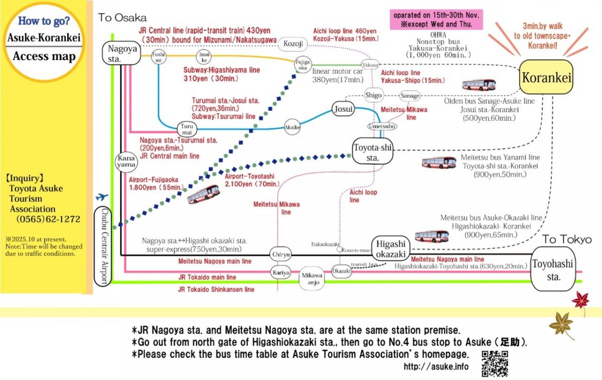 ※预计路况拥堵的周末节假日,从“近冈上”沿着153号线直行,在香岚溪前的“足助大桥”停车。“足助医院”站不停车。