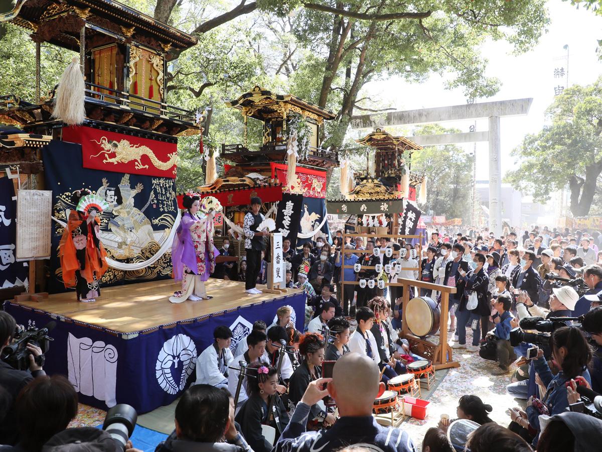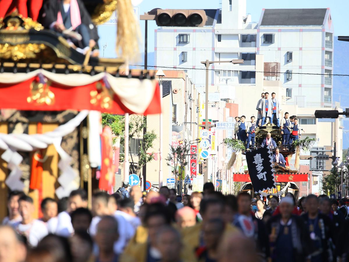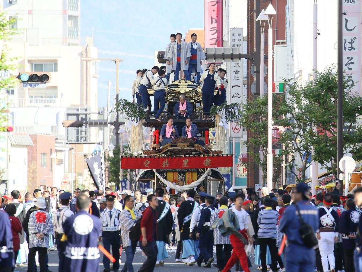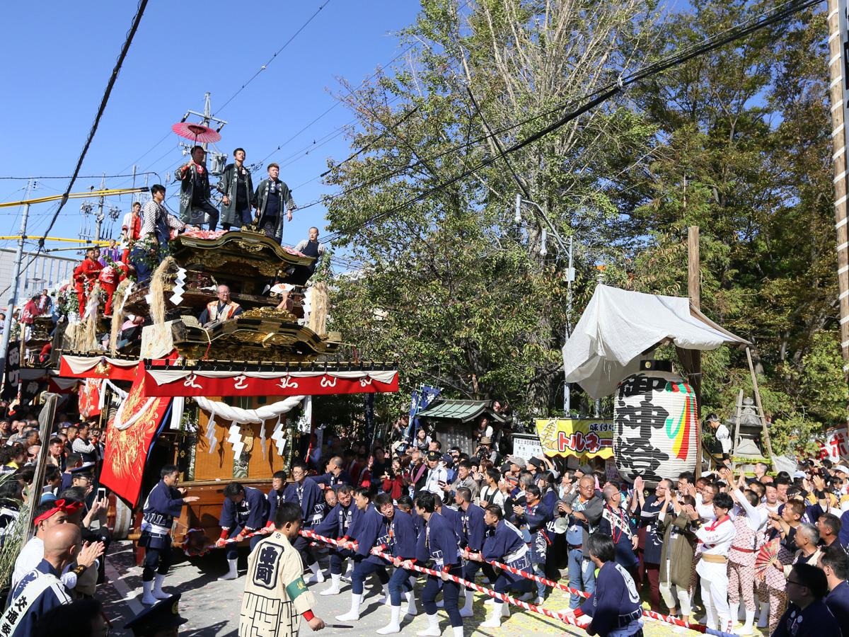 山车高6米左右,重达5吨,配木制脚轮,中间的车身像个方盒子,盒子前方有个小舞台,上方还有个加顶的舞台。车上的装饰元素有传统灯笼、金饰漆梁、画着各种瑞兽花草的贴金木雕,还有绣着日本和中国历史和神话故事的帐幔。每辆山车需要数十人齐心协力,和着号子推动前行。