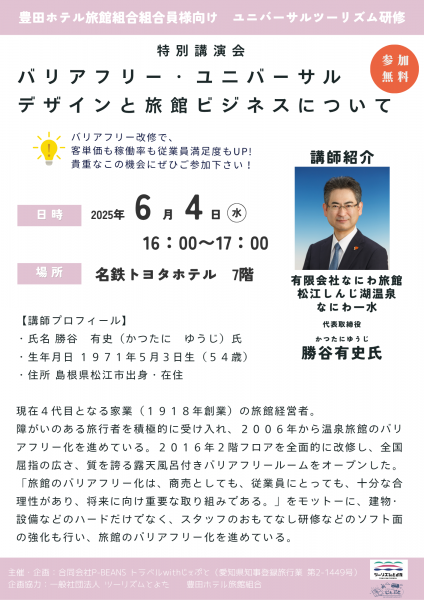 ツーリズムとよたでは、今年度から豊田市でユニバーサルツーリズムの普及を目指す取り組みを本格的に展開しており、6月4日、豊田ホテル旅館組合の総会の中で、その第一歩となる講演会を開催しました。