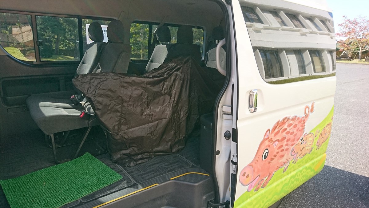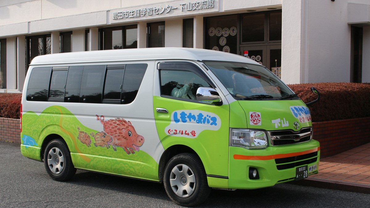 ▲下山支所に到着。ここからは、しもやまバスで!車体に描かれているイノシシたちが可愛いです。