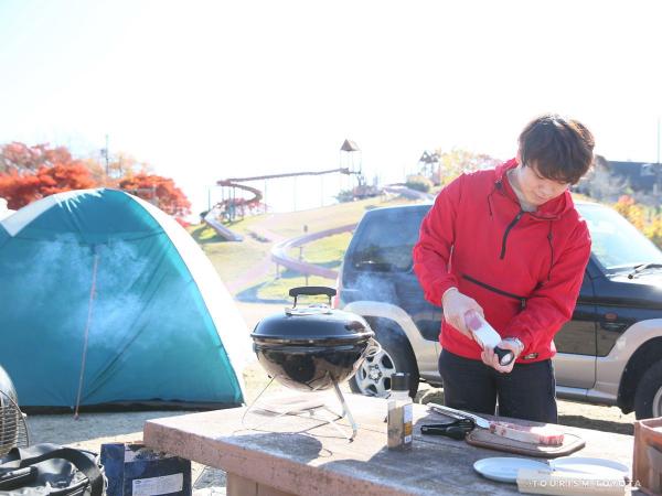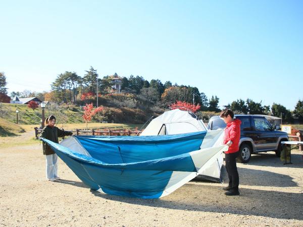 オートキャンプサイトに到着したら、さっそくテントやグリルの準備!レンタルのテントを広げ、説明書を見ながら作業をします。共同作業でテントを組み立てていると、「キャンプに来たなー」という思いで気分も高ぶります。慣れない作業も協力してやると楽しいですね♪