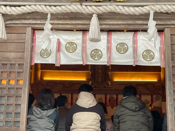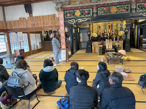 画像2枚目は、松平東照宮の宮司さんより、松平家のゆかりの著名人が多岐にわたり活躍をされているなど、興味深いお話しを伺いました。その後、松平地区で見られる季節の草花が描かれている108枚の漆絵の天井画も見学。