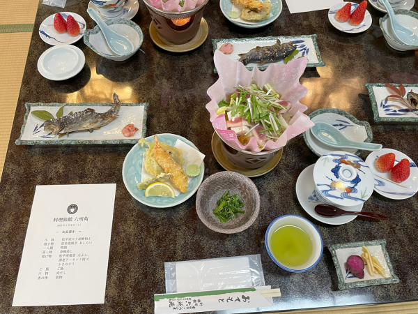 大給城跡から車で約10分の場所にある料理旅館「六所苑」さんにて昼食をとりました。冷えた身体が温まる、出汁のきいたお鍋は六所苑さんの名物料理です。また、松平地区のセリや椎茸を利用した料理は、参加者の皆さんも好評でした。