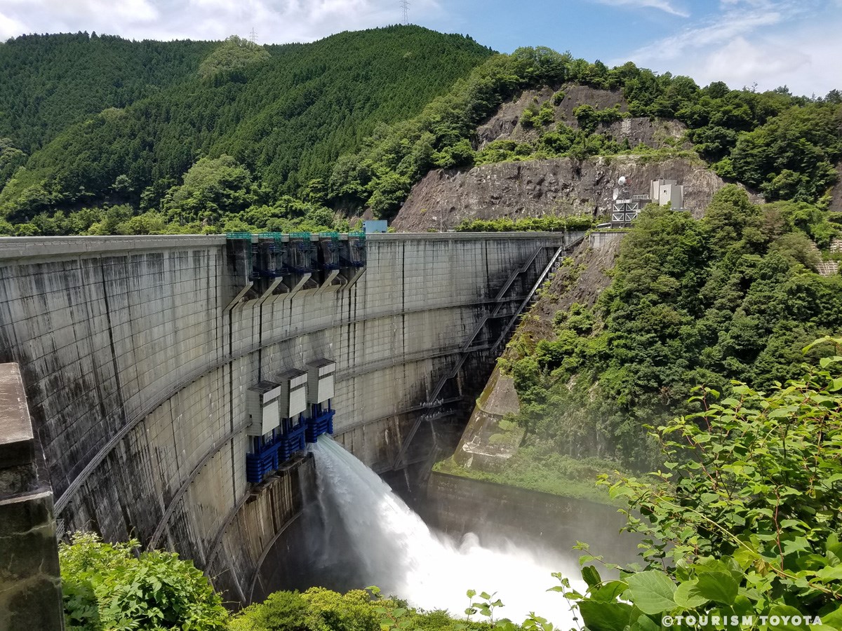矢作ダムは、矢作川上流約80㎞地点の愛知県と岐阜県の県境に位置するアーチ式コンクリートダムで、放物線を描く形が美しいダム。放流を間近で見られるタイミングは必見。