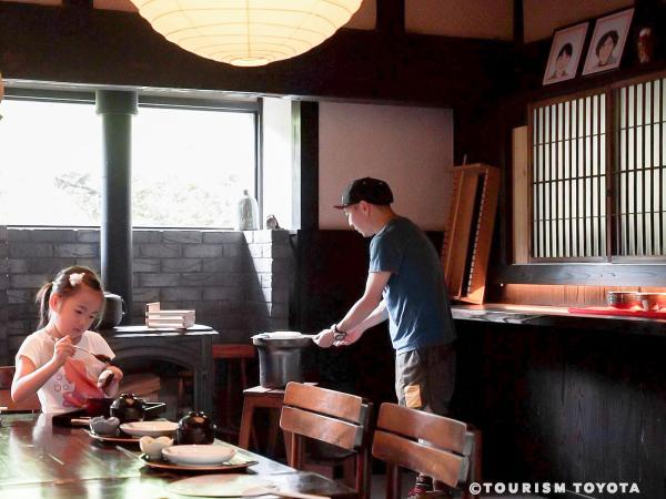 たっぷり体験を楽しんだ後は、築150年の古民家にお泊りできる民泊施設へ。BBQをしたり、簡単なキッチンもあるので買ってきた豊田の食材で地産地消パーティーもできます。次の日の朝は自分で焼いた五平餅をいただく朝ごはん体験もオススメです!