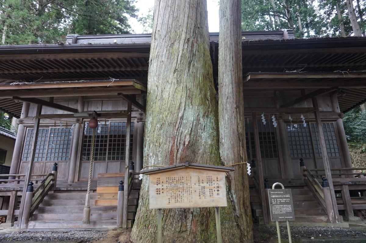 Both estimated to be about 700 years old, the giant "sugi" cedar embracing the "hinoki" cypress at the base make them both appear to be one a single tree. The perimeter of the combined trunk at ground level is about 8 meters. This impressively huge work of nature is prayed upon by the locals for marriage happiness.