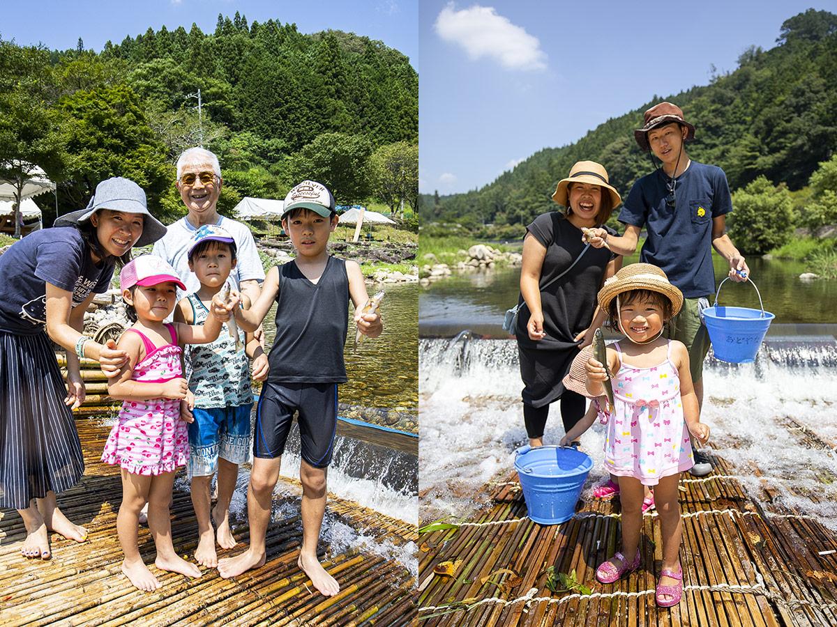 Step onto the bamboo fishing platform and try catching ayu sweetfish with your bare hands!