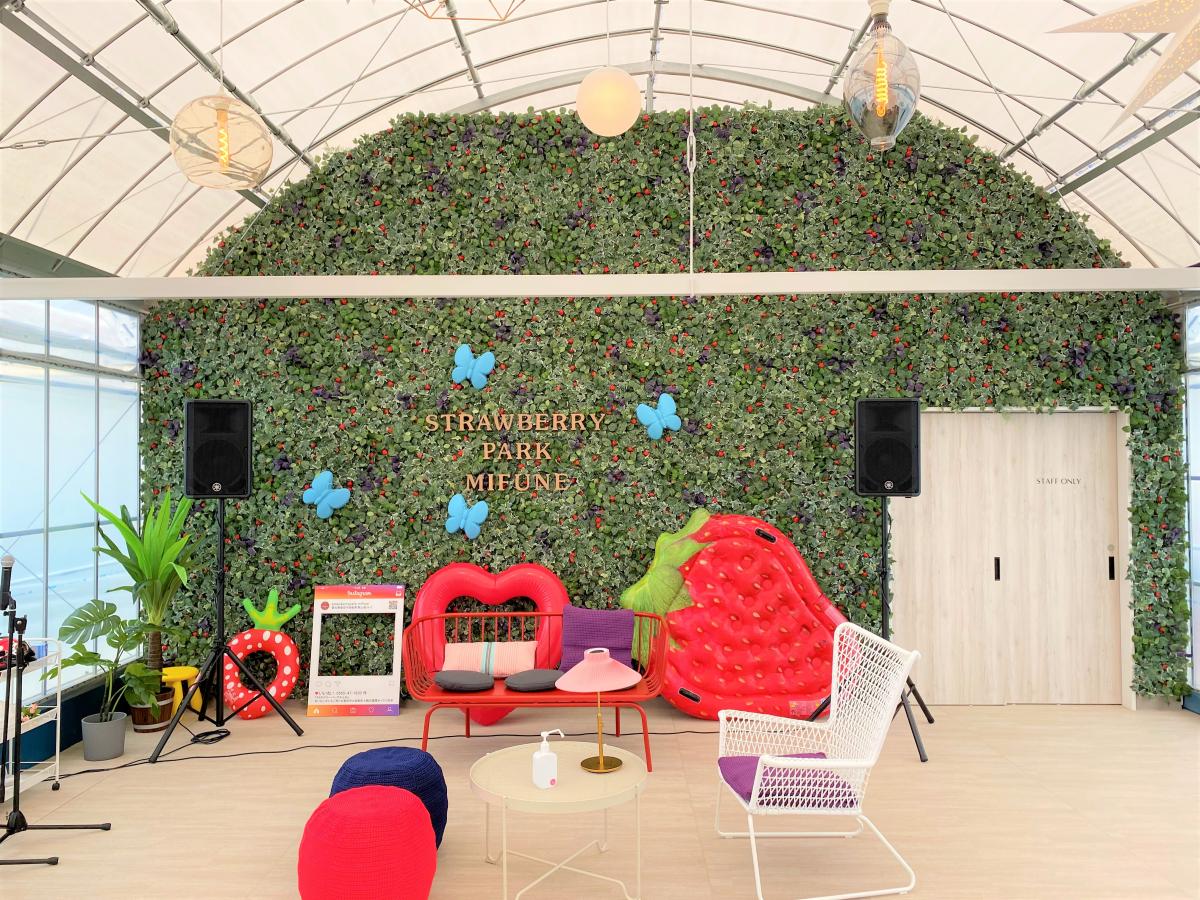 Strawberry Park MIFUNE offers simple strawberry picking from elevated beds on concrete flooring, letting you harvest your share of sweet strawberries without the dirt of a typical agricultural establishment. It also offers enjoyment to anyone with accessible spacing for guests in wheelchairs or those coming with strollers.