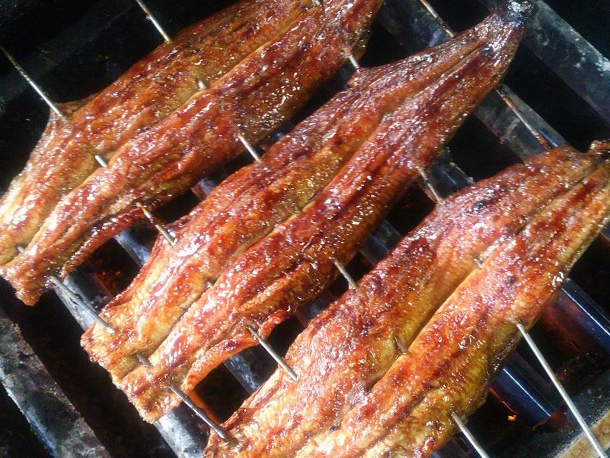 Rice topped with five slices of eel grilled to perfection—crispy on the outside and soft on the inside.