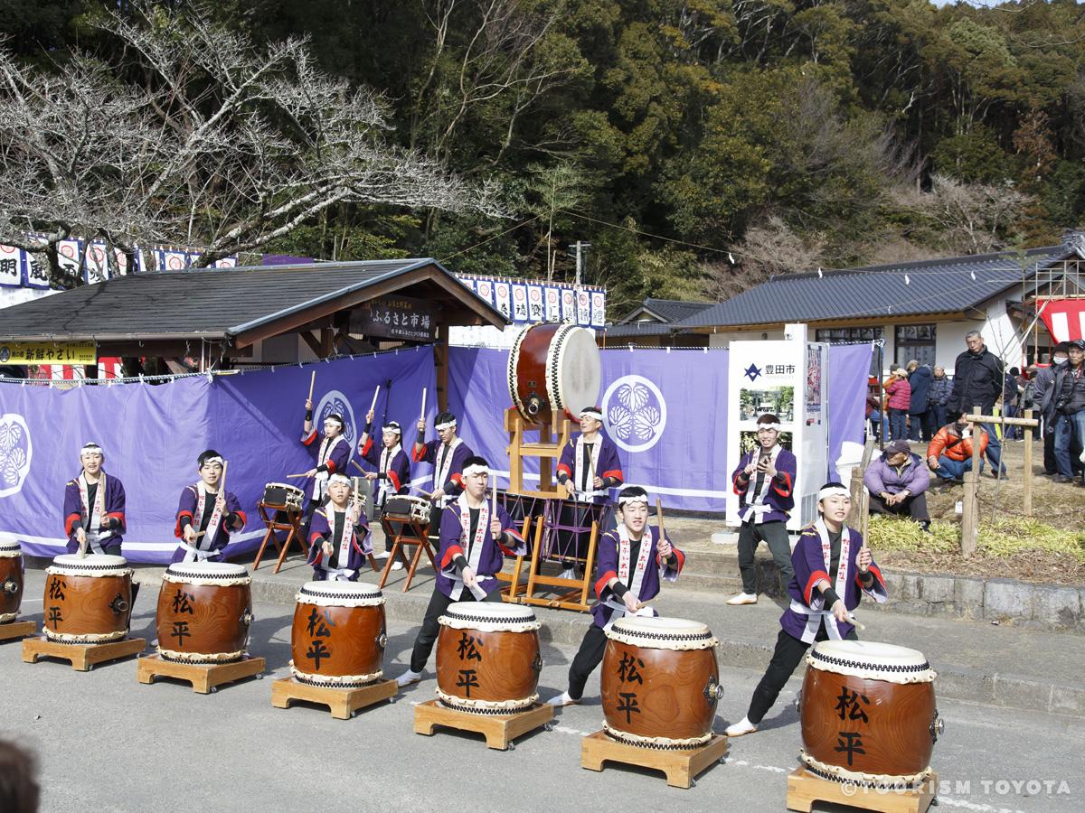 The annual Tenka Festival (Tenkasai) is held in Matsudaira-go on the second Sunday of February to honor Matsudaira Chikauji (d. 1394?), the founder of the Matsudaira family. According to family lore, Chikauji, who lived in turbulent times, wrote a prayer in which he hoped for peace throughout the land. That wish came true eight generations later when Chikauji’s descendant Tokugawa Ieyasu (1543–1616) unified the country and established the Tokugawa shogunate. The Tenka Festival commemorates the Matsudaira family’s role in bringing peace to the realm with various purification and luck-bringing rituals.