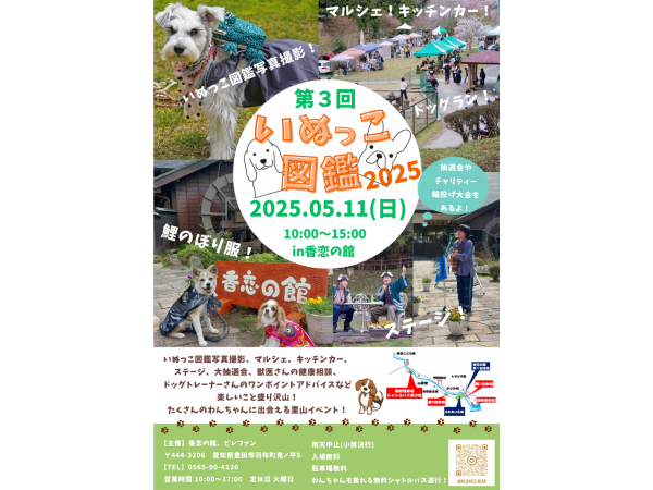 全犬種集合!「いぬっこ図鑑」 香恋の館でのわんこイベント! 山に囲まれた大自然の中のドッグランでわんこたちが走る姿を楽しみましょう。 マルシェ、ワークショップなど楽しいこと盛りだくさんです!! 愛犬と一緒に素敵な思い出つくりませんか?