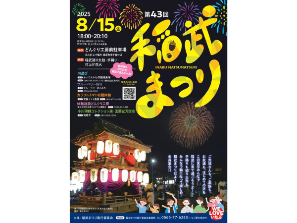 稲武地区最大の夏祭り。稲武廻り太鼓や手踊には誰でも参加することができます。また、近くから見ることのできる手筒花火や打ち上げ尺玉花火は必見です。