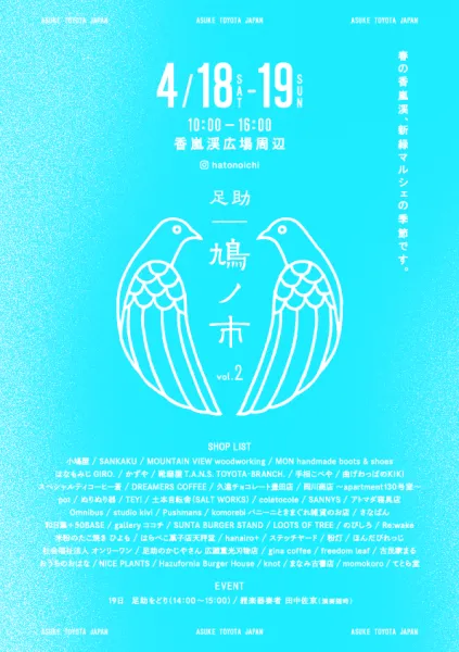 足助好きが集まるマルシェ「鳩ノ市」第二弾を開催します。 個性豊かな49店舗(食×物販×体験)が、新緑の香嵐渓に出店します! 是非、体感しにお越しください。
