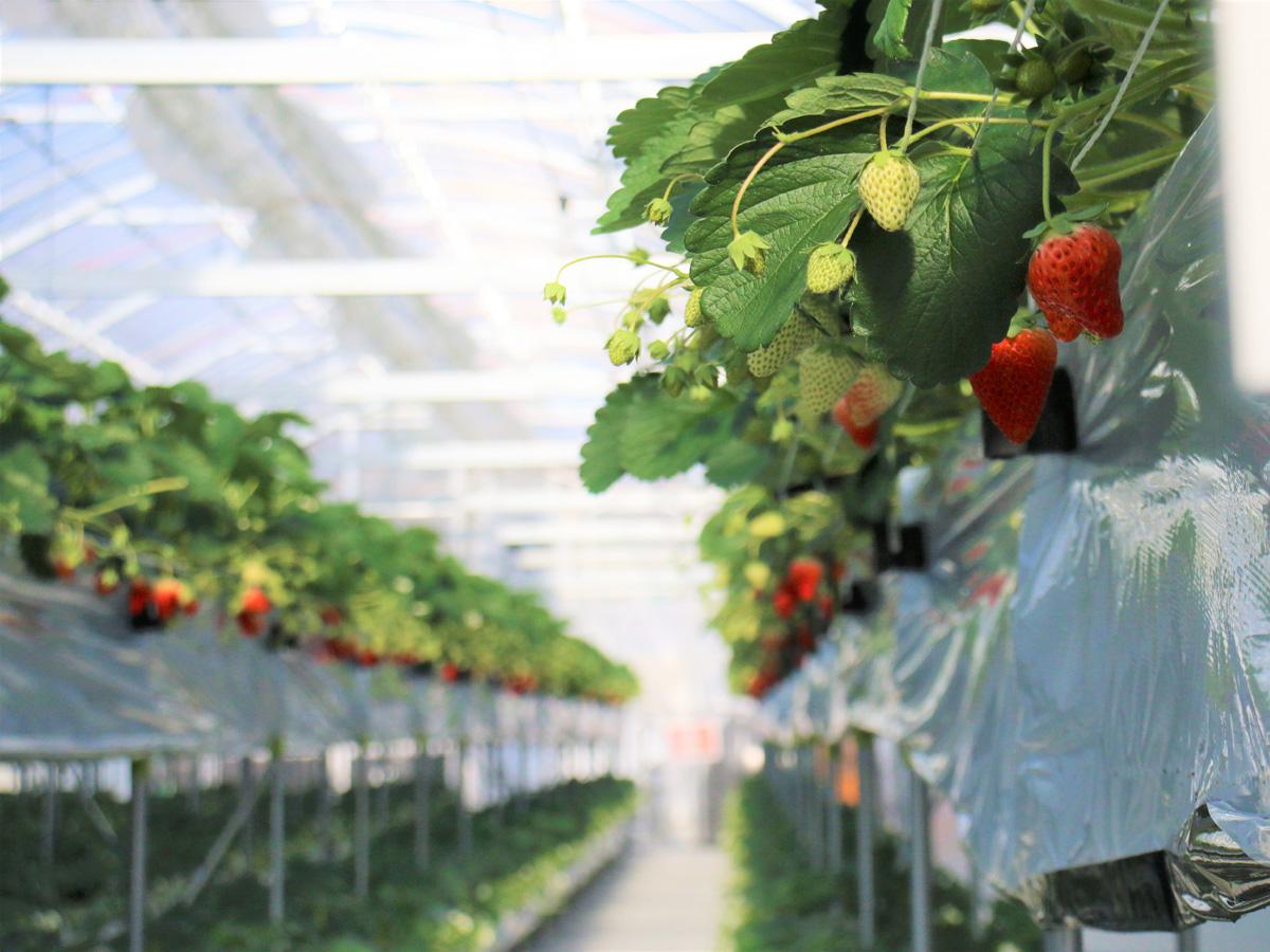 高設ゆりかご栽培&前面床コンクリート張り!土汚れを気にせず楽しめるいちご狩り農園です。