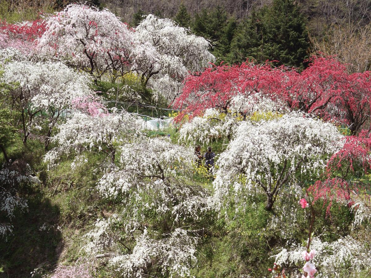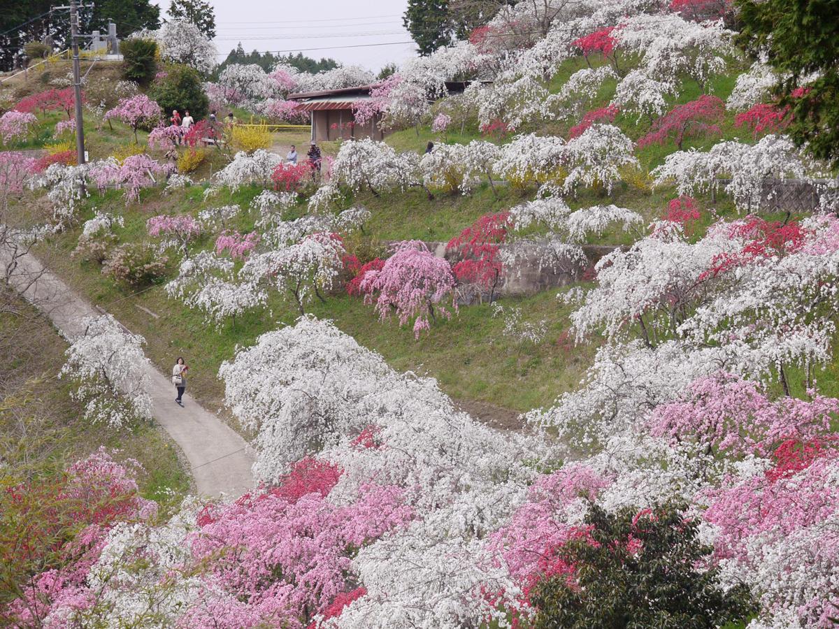 見頃に設置される臨時駐車場から、約1㎞続く散歩道の各所に、しだれ桃が美しく咲き誇っています。