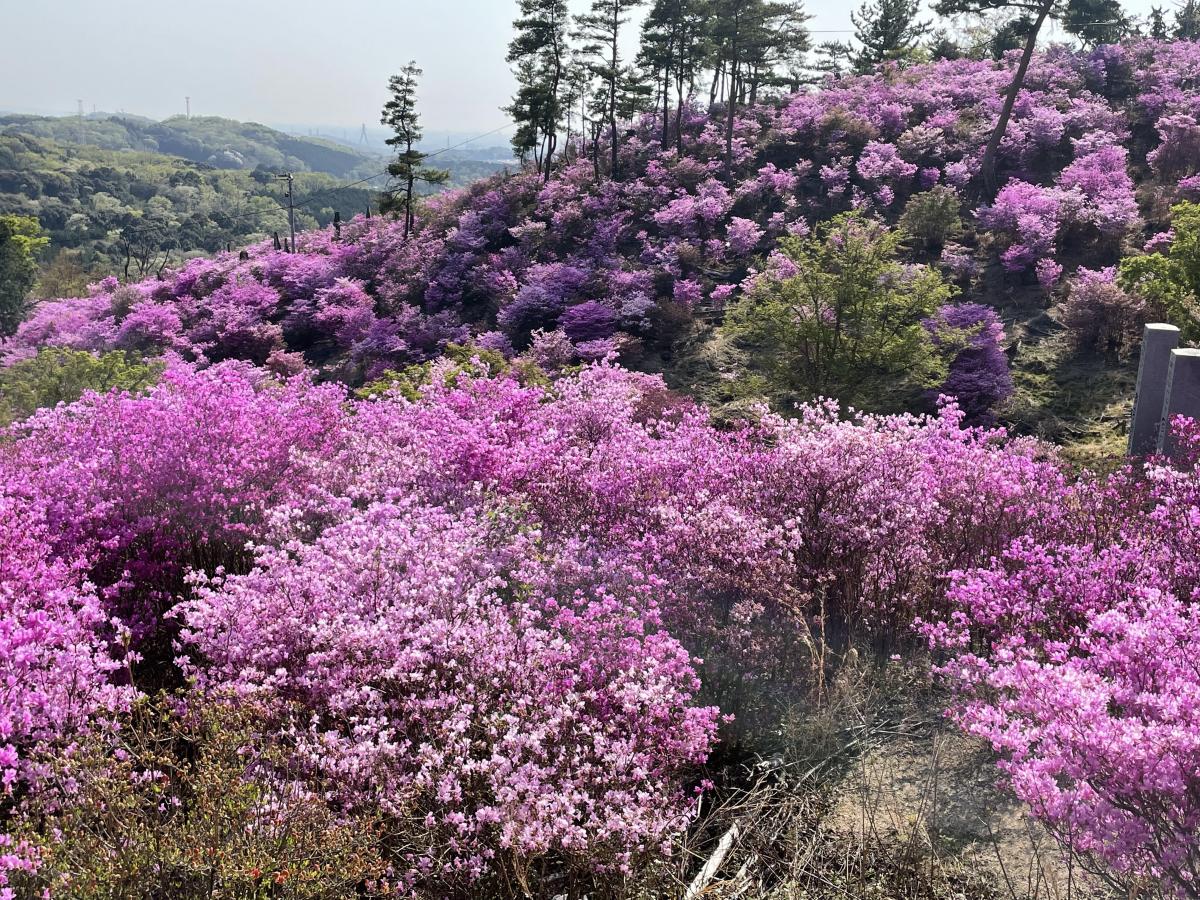 ソメイヨシノの見頃が終わる頃、4月上旬から中旬にかけて、コバノミツバツツジが、弘法御嶽山信仰の石碑を埋めるように山の斜面いっぱいに群生しています。市の名木指定もされています。