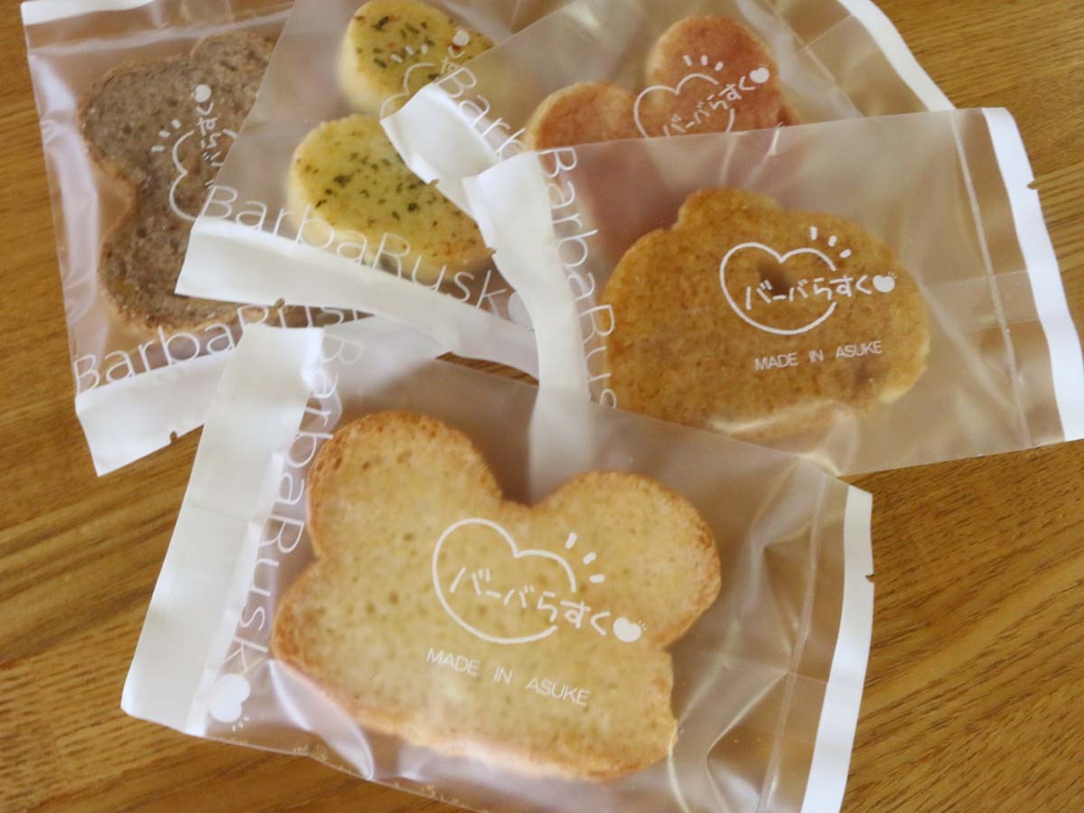 Tutti i nostri prodotti sono fatti a mano nel nostro negozio, il Bā-bara House di Hyakunenso. "Hyakunenso" si trova a 3 km dall’area di Korankei. Qui si trovano un hotel, ristoranti e altro. Le gallette sono disponibili in quattro gusti: semplice, aglio, caramello e noce (tutti a 380 yen). Abbiamo anche due gusti aggiuntivi: acciughe e gusto della stagione (entrambi a 450 yen).