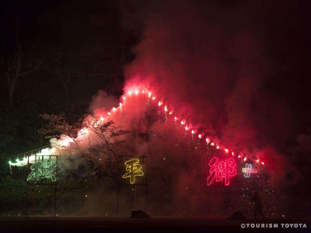 현재 이 축제는 이에야스의 기일인 4월 17일 직전 주말에 열립니다. 토요일 저녁, 마쓰다이라 도쇼구 신사의 신관이 신사의 뒤편에 있는 ‘산탕의 우물’에서 신수를 퍼올려 신들에게 바칩니다. 이 물은 대대로 마쓰다이라 가문에서 태어난 갓난아기의 첫 목욕에 사용되었다고 합니다. 그 다음에는 북과 춤이 펼쳐지며, 데즈쓰 불꽃놀이가 밤을 물들입니다. 아이치현의 축제에서 흔히 볼 수 있는 데즈쓰는 대나무 통에 밧줄을 감고 화약을 채워 넣은 것으로 높이 10m까지 불꽃을 쏘아 올릴 수 있습니다. 도쿠가와 이에야스 시대에 전장의 신호로 사용되었던 것에서 발전한 것으로 보입니다.