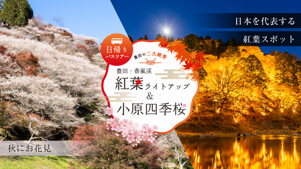 News&Topics 2025/5/29 (木) お知らせ 「豊田・香嵐渓紅葉ライトアップ& 小原四季桜日帰りバスツアー」見所紹介ページを公開しました。 今年も香嵐渓のライトアップと小原四季桜を楽しめるバスツアーが開催されます。 見所紹介ページでは、「小原和紙の紙すき体験」と「柿食べ比ベ」の2種類のツアーコースをご紹介しています♪ 「豊田・香嵐渓紅葉ライトアップ& 小原四季桜日帰りバスツアー」見所紹介ページ 一覧へ戻る