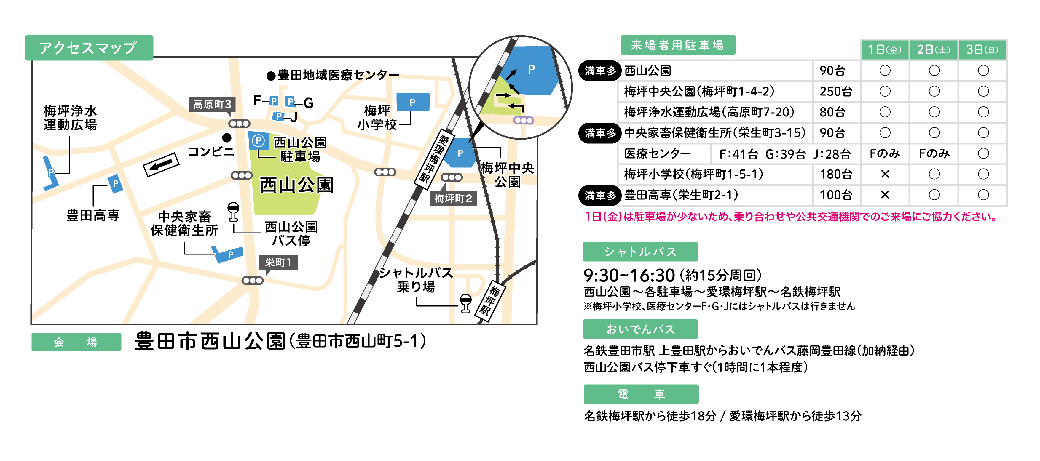 | 駐車場 | ・西山公園駐車場 90台 ・梅坪中央公園(豊田市梅坪町1-4-2) 250台 ・梅坪浄水運動広場(豊田市高原町7-20) 80台 ・中央家畜保健衛生所(豊田市栄生町3-25) 90台 ・医療センター F41台・G39台・J28台 ※5月1日(金)・2日(土)はFのみ利用可 ・梅坪小学校(梅坪町1-5-1)180台 ※ 5月1日(金)は利用不可 ・豊田高専(栄生町5-1)100台 ※5月1日(金)は利用不可 ※ 利用可能日を予め確認のうえご利用ください ※5月1日(金)は駐車場が少ないため、乗り合わせや公共交通機関でのご来場にご協力ください ※ シャトルバスは梅坪小学校、医療センターF・G・Jには行きませんのでご注意ください |
