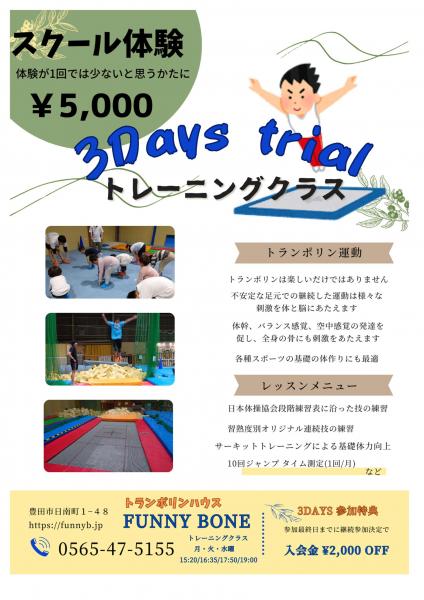 体験が1回では少ないと思う方に、3日間体験できるトレーニングクラスもありますよ!