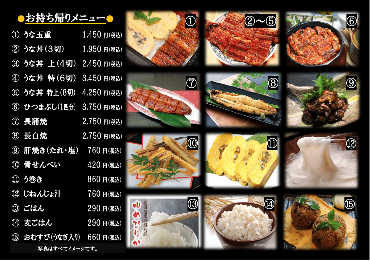 ◎うな丼(3切):1,950円 ◎うな丼上(4切):2,450円 ◎うな丼 特(6切):3,450円
