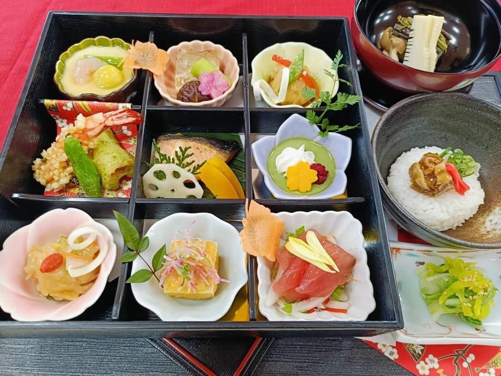 松花堂弁当は刺身や揚げ物、煮物等の食材が満載のリーズナブルで女性にとても人気です。