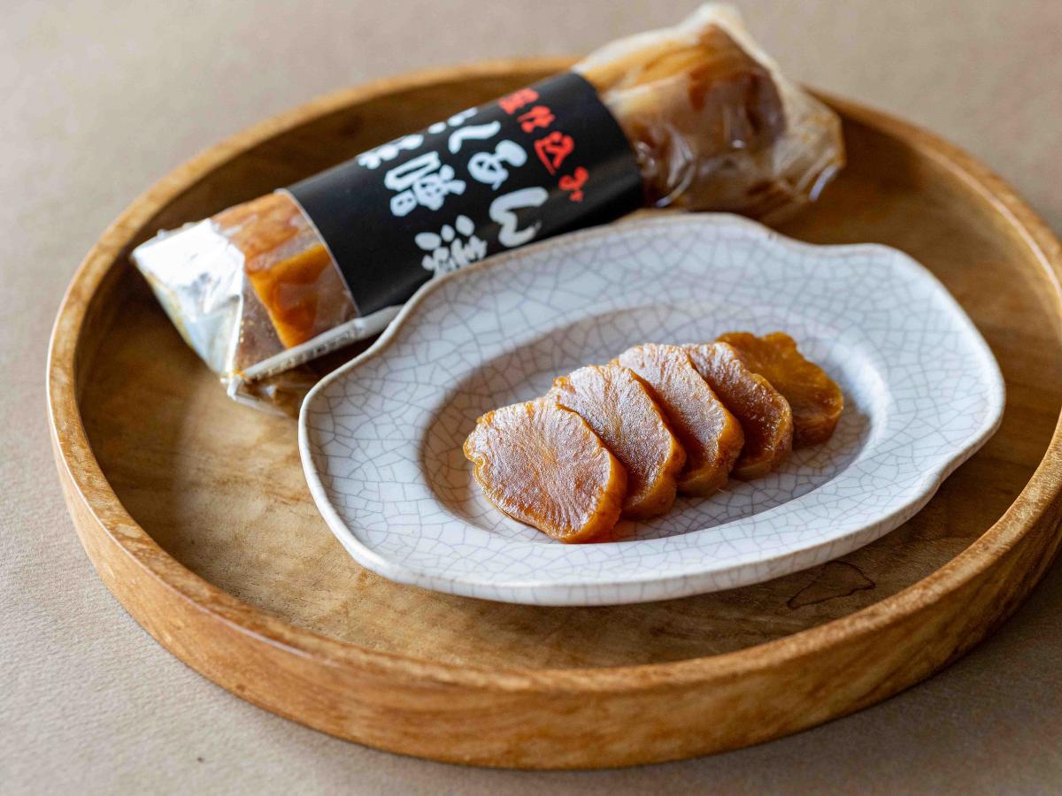 糠(ぬか)漬け、味噌漬けの二段仕込みでパリッとじゅわっとした食感に。旅館の朝ごはんにも利用していただいています。白いごはんと、お味噌汁の間にたくあんの味噌漬けが絶妙な箸休めになります。