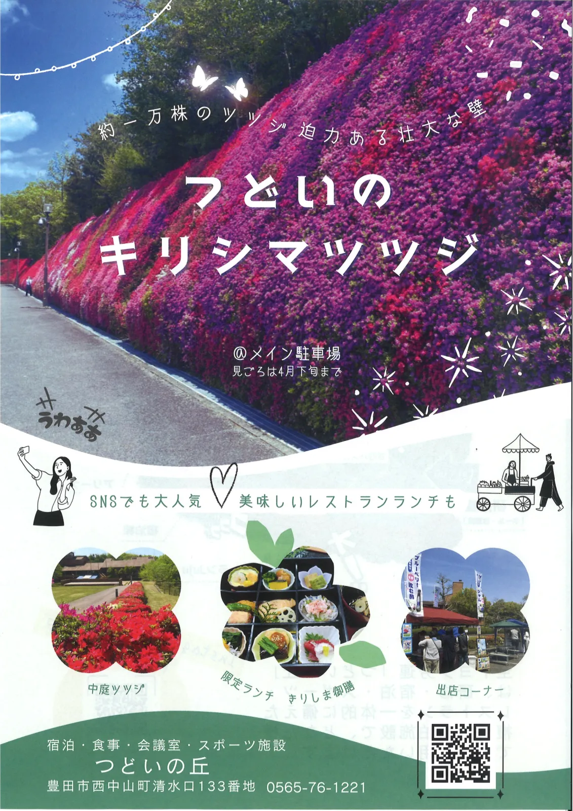 全トヨタ労連研修センター「つどいの丘」では、4月中旬~5月初旬にかけて敷地内のきりしまツツジが見ごろを迎えます。約1万株のツツジが咲き誇り、高さ5m程の美しい花の壁は圧巻! 豊田市の花名所にも選ばれ、毎年多くの人が訪れます。また、全長1.5kmの散歩道「四季路」もあり、森林浴が楽しめます。