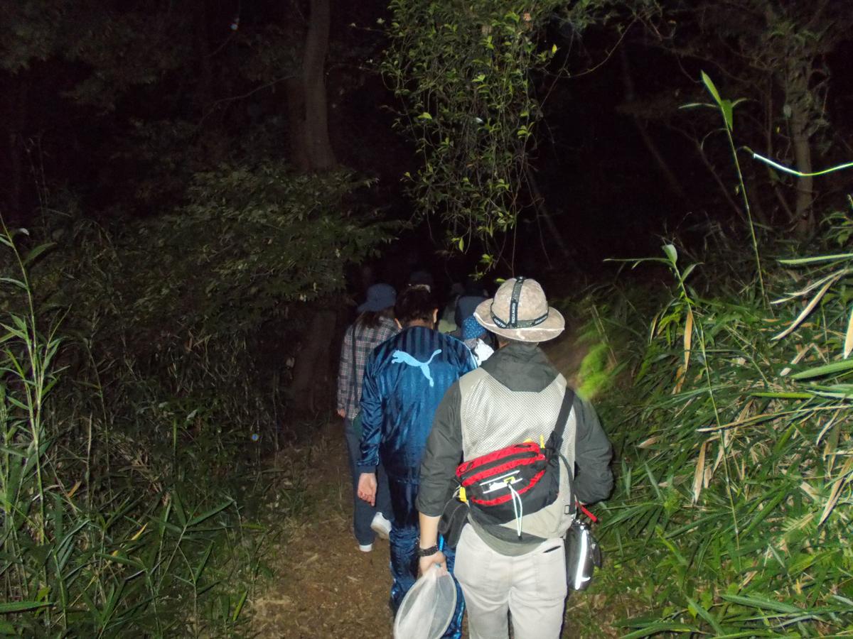 夜の森を歩いてヘイケボタルを探しに行きます。