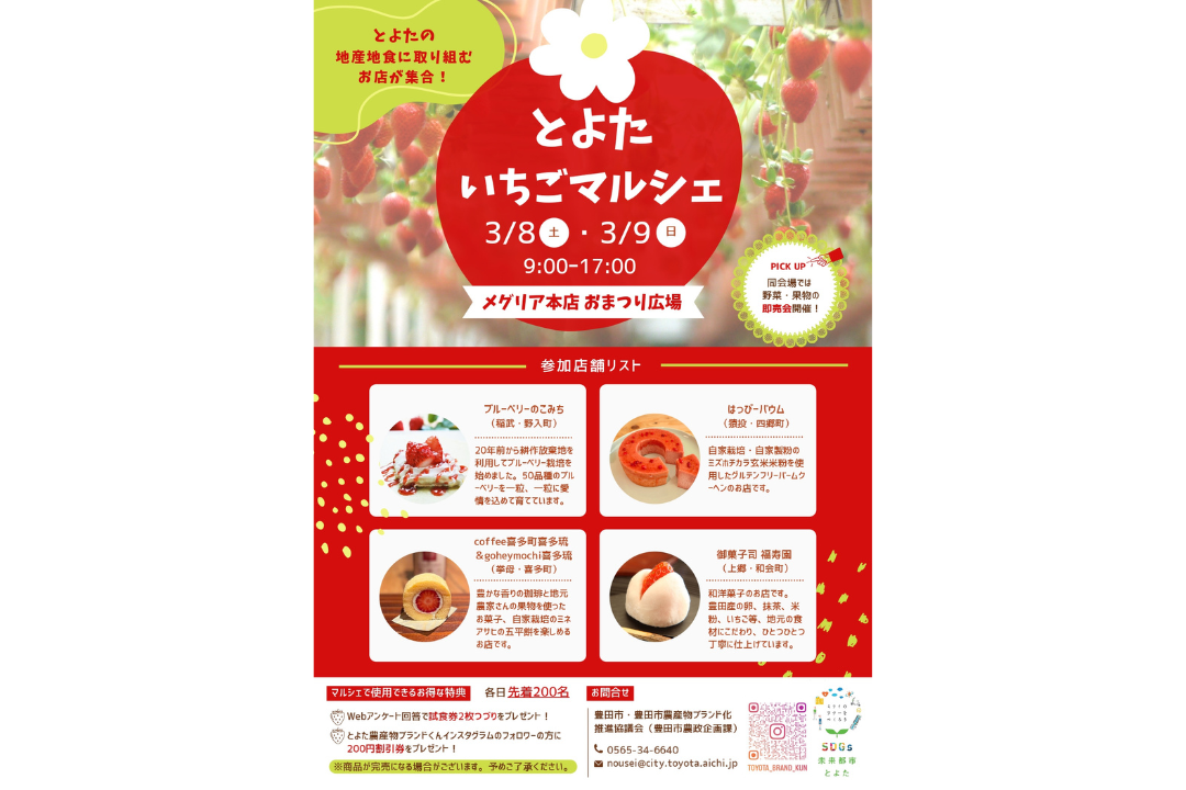 とよたSDGsパートナーであるトヨタ生活協同組合の協力のもと、「とよたいちごマルシェ」が開催されます。市内で地産地食に積極的に取り組む生産者や事業者が出店し、いちごを使用した加工品を主に販売します。また、事務局ブースでは、Webアンケートに回答していただいた方やとよた農産物ブランドくんのインスタグラムのフォロワーの方に、マルシェで使用できる試食券や割引券の配布を実施します。