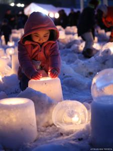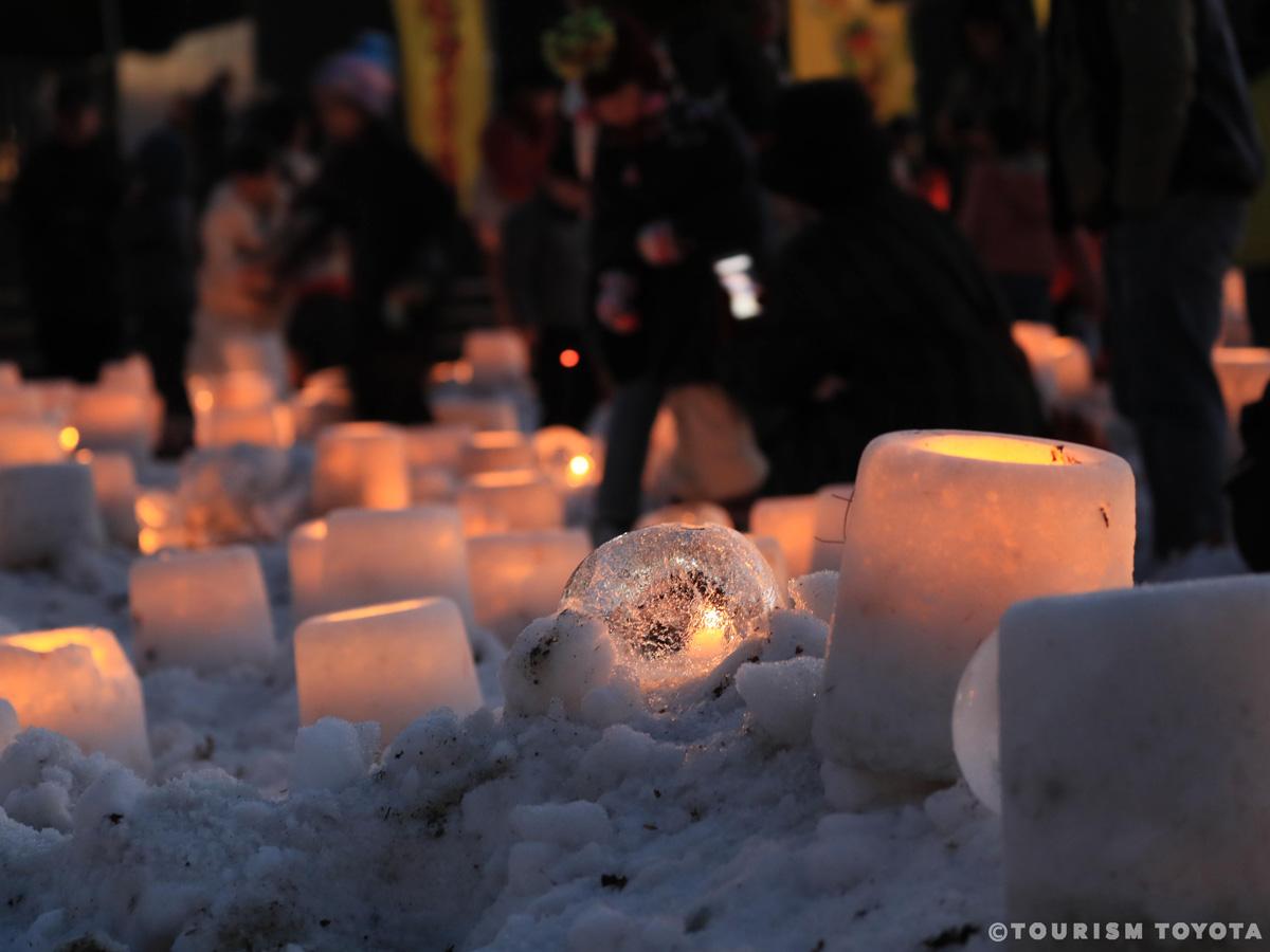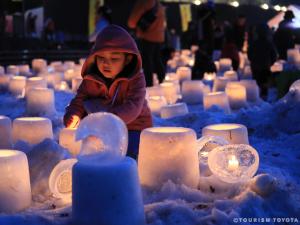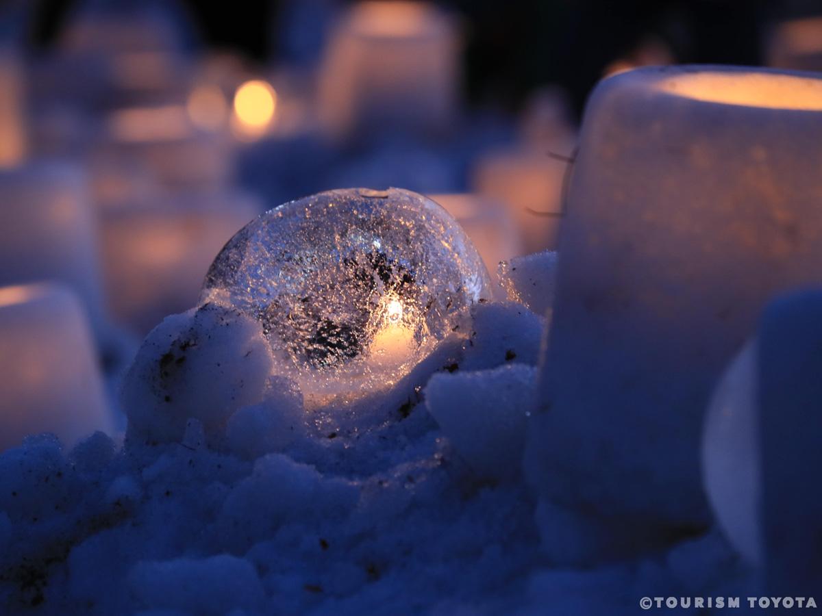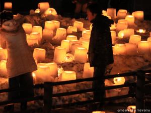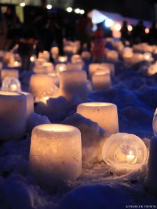 雪で作った灯ろうにキャンドルのあかりを灯して、優しい灯りが神秘的な夜を演出します。