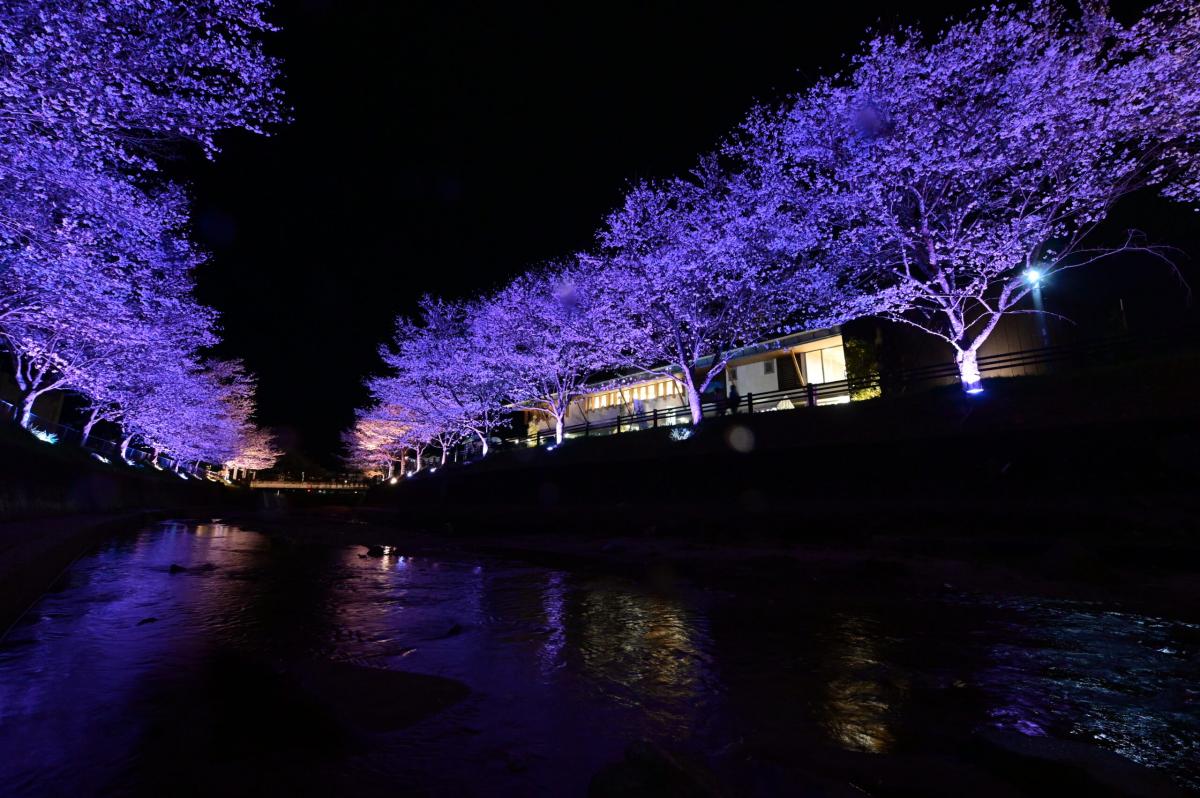 藤岡交流館の横を流れる飯野川沿いの約100mの桜並木ライトアップを開催します。