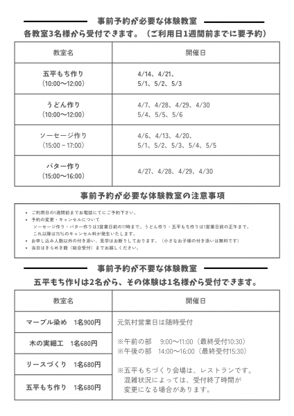 | 予約について | <事前予約が必要な体験教室> 五平もち作り・うどん作り・ソーセージ作り・バター作り ※注意事項 ◎ご利用日の1週間前までにお電話にてご予約ください。 ◎各教室3名様から受付可能です。 ◎予約変更、キャンセルについては次の通りです。 ソーセージ作り・バター作り:3営業日前の17:00まで うどん作り・五平もち作り :1営業日前の12:00まで これ以降は、75%のキャンセル料が発生します。 ◎申込人数以外の付き添い、見学はお断りしております。 (小さなお子様の付き添いは無料です。) ◎当日はきらめき館(総合受付)までお越しください。 <事前予約が不要な体験教室> マーブル染め・木の実細工・リース作り・五平もち作り ◎五平もち作りは2名様から、その他の体験は1名様から受付可能です。 ◎元気村営業日は随時受付 ◎五平もち作りの体験会場はレストランです。 混雑状況により、受付終了時間が変更となる場合があります。 ※五平もち作り体験は、事前予約が必要な体験と不要な体験の2種類ございます。 |