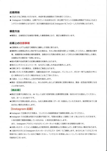 ・応募いただいた写真は無償で、当観光協会のHP、Instagram、パンフレット、ポスター等下山地区のPRに広く使用させていただく場合があることをご了承ください。