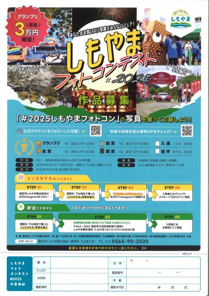 | 開催時期 | 【期間】 2025年1月1日(水)~2025年12月31日(水) ※ 期間内に下山地区で撮影したもの 【締切】 2026年1月16日(金) ※ 当日投稿・消印有効 |