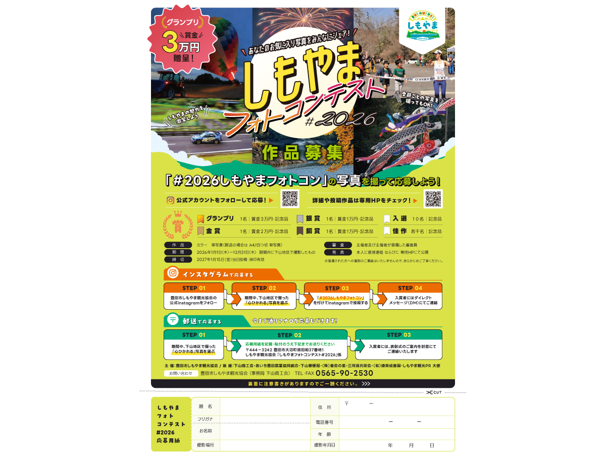 | 開催時期 | 【期間】 2026年1月1日(木)~2026年12月31日(木) ※ 期間内に下山地区で撮影したもの 【締切】 2027年1月15日(金) ※ 当日投稿・消印有効 |