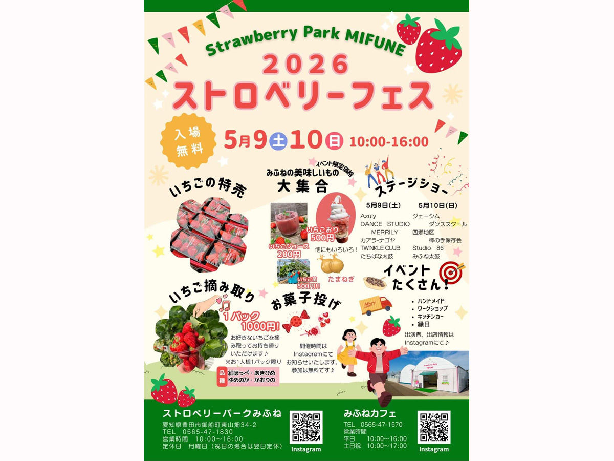 ストロベリーパークみふねにて、いちごはもちろん、いちごをふんだんに使ったジャムやジュース、キッチンカー等でグルメがお楽しみいただけるほか、ワークショップやステージショーが楽しめるストロベリーフェス2026が開催されます。