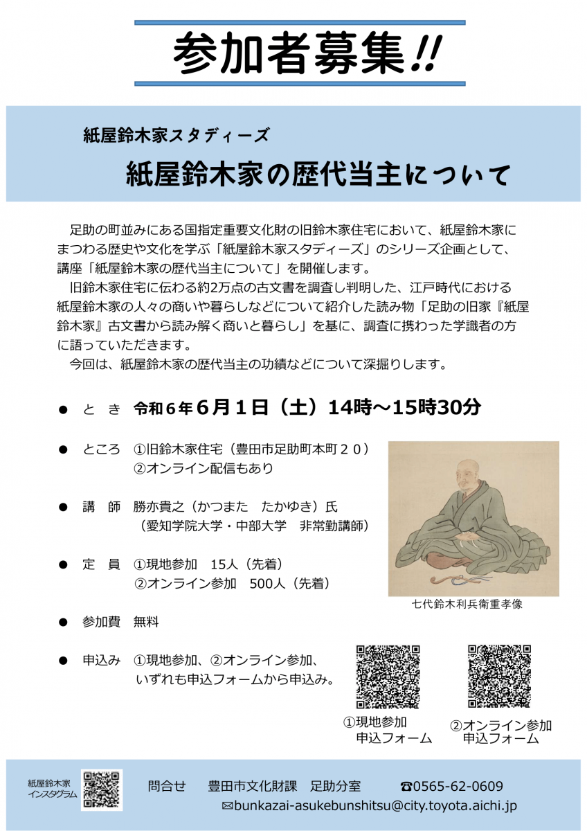 旧鈴木家住宅に伝わる約2万点の古文書を調査し判明した、江戸時代における紙屋鈴木家の人々の商いや暮らしなどについて紹介した読み物「足助の旧家『紙屋鈴木家』古文書から読み解く商いと暮らし」を基に、紙屋鈴木家の歴代当主の功績などについて語っていただきます。