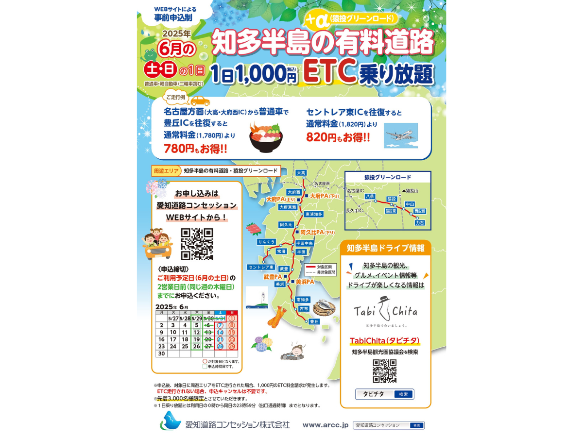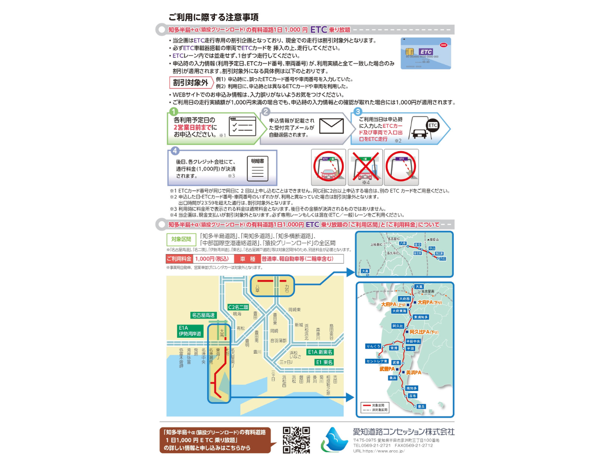 | 関連サイト | 愛知道路コンセッション株式会社 公式サイト「知多半島の有料道路ETC乗り放題」 |