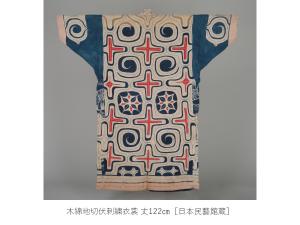 オヒョウやイラクサなどの靭皮繊維で織られた衣裳、本州から渡った古い木綿に切伏や刺繍を施した衣裳、そして幾何学文