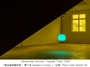 玉山拓郎は絵画制作を出発点としながら、早くから立体的な造形や光、映像、音を組み合わせたインスタレーションを展開してきた、現在最も注目を集める作家の一人です。日常的に用いられる机や電球が大地や星々のようにも見えるなど、玉山の作品は内なる場(In-terior)と外界(ex-terior)の関係へと想像をひろげつつ、大小のスケールの振れ幅に両者の境界を問うてきました。とはいえ同時に、玉山の作品は明確な境界線を引くのではなく、異なるものが流通し、また衝突する不可分で動的な領域=界面として現れます。今回の展覧会で展示されるのは基本的にはただ一つのインスタレーションのみ。豊田市美術館の特徴的な展示空間に、建築とも、構造物とも、あるいは立体作品や彫刻ともつかない巨大な物体を貫入させます。日の光の移ろいによって刻々と変化する展示室に、ひとつのインスタレーションがさまざまなかたちであらわれる。日常的なスケール=基準がいったん保留され、ずらされる、この未知なる領域(territory)において、わたしたちは空間と時間のなかでなにかを体験することそのものをあらためて見つめ直すことになるでしょう。