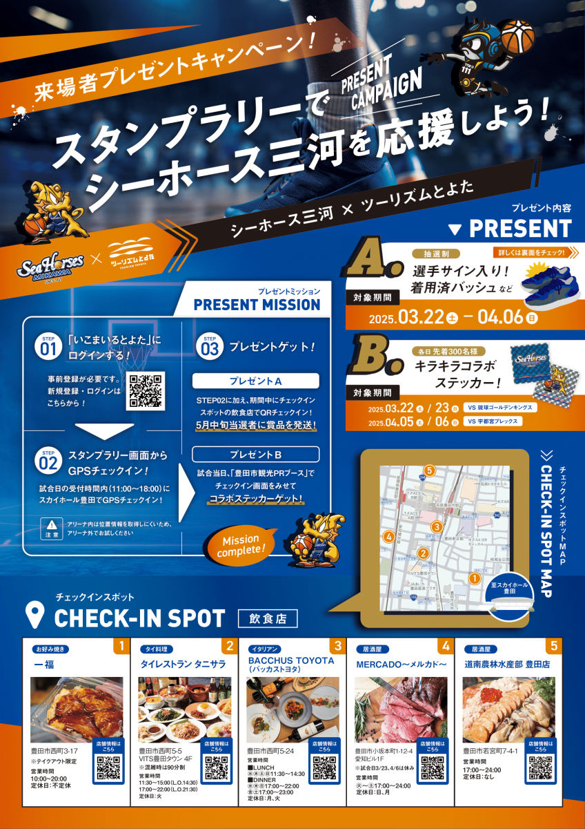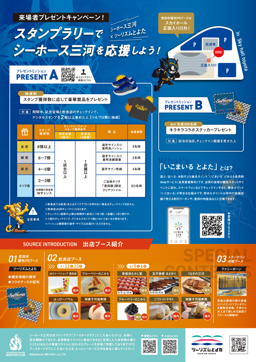 ツーリズムとよた×シーホース三河 来場者プレゼントキャンペーン~スタンプラリーでシーホース三河を応援しよう!~ |