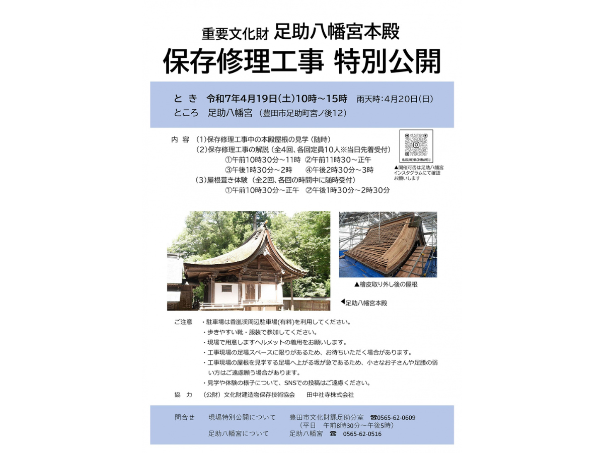 | 電話番号 | 修理工事特別公開について: 豊田市役所 足助支所 文化財課足助分室 0565-62-0609 足助八幡宮について: 足助八幡宮 0565-62-0516 |