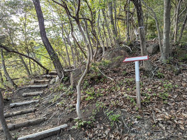 散策道は少し傾斜もあり、整備はされていますが、トレッキングで使用するような靴をおすすめします。画像にもある、赤い矢印に従って進めば、山頂までたどりつけます。