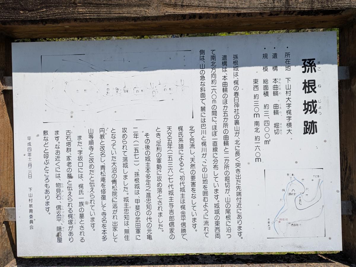 梶氏系譜によると、初代城主は梶金平信勝で、天文5年(1536)七代城主与吉郎信家のとき、足利の軍勢に攻め落とされ、その後の城主本多定之進忠知の代の元亀2年(1571)、孫根城を含む下山地区の諸城(大桑城、羽布城など)は、甲斐の武田軍に攻められて落城した、と伝えられています。