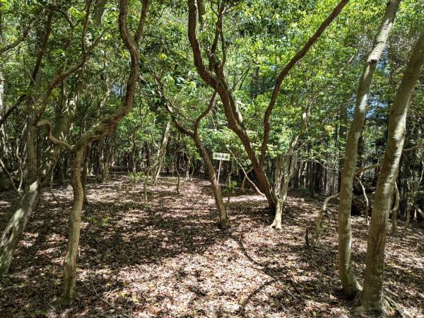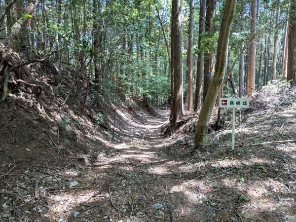 「孫根城跡」の看板がある曲輪Ⅰは、樹木が生い茂り、視界は良好とはいえませんが、敵を寄せ付けない、迫力ある切岸(人工的な断崖)を確認することができます。